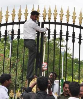 Also, who are participating in the protests ? Law breaking ‘law’less students who aspire to become ‘lawyers’. How do they protest ? By climbing on trains and staging ‘rasta-roko’. Here we see pictures of ‘lawyers’ climbing the gates of the high court in Madurai Tamil Nadu. Probably this is how lawyers ‘stand-up’ for justice to prevail .(Note that these people had not come out to protest for Anna Hazare.)