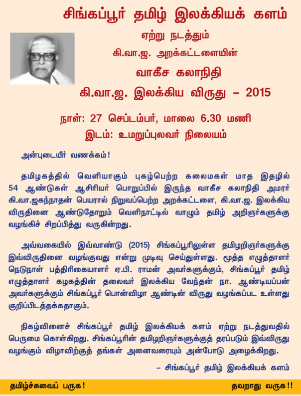 சிங்கப்பூரில் யாருக்காவது எதற்காகவாவது விருது வழங்கிக்கொண்டே இருக்கிறார்கள். உள்ளூருக்குள் வழங்கிக் கொள்வது வழக்கம்.