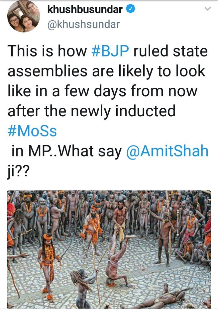 When the BJP formed government in Madhya Pradesh, Khushbu had tweeted thus, saying the Madhya Pradesh cabinet would be constituted by these half clad sadhus, referring to the presence of holy men in the party and government.