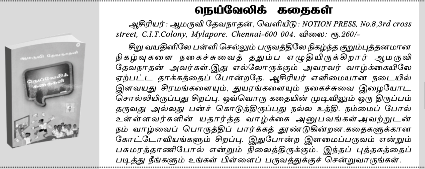 கலைமகள் பத்திரிக்கையில் ‘நெய்வேலிக் கதைகள்’ நூல் மதிப்புரை வந்துள்ளது. வெளியிட்ட கலைமகள் நிறுவனத்தாருக்கு நன்றி.