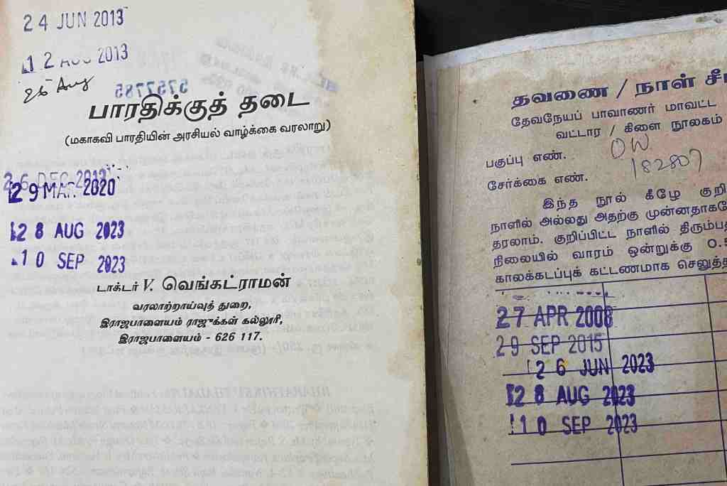 ‘பாரதிக்குத் தடை’ நூலை ஜூன் 2013 அன்று யாரோ எடுத்துள்ளார். பின்னர் நான்கு பேர் எடுத்துள்ளனர். கடைசி இரண்டும் தேதிகளும் நான் எழுத்தது.