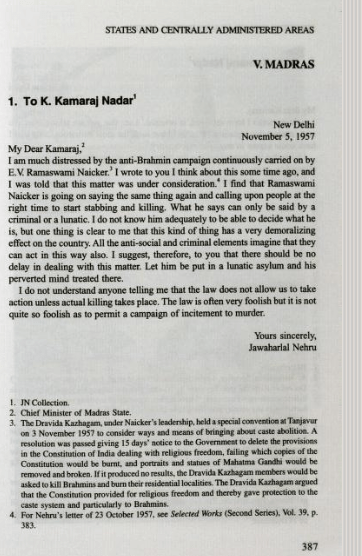பி.கு.: நவம்பர் 3, 1957 அன்று தஞ்சாவூரில் நடைபெற்ற தி.க. மாநாட்டில், அம்பேத்கர் எழுதிய அரசியல் அமைப்புச் சட்டத்தில் மத உரிமைகளுக்கான உத்தரவாதங்கள் இருந்ததை நீக்க வேண்டும் என்று தீர்மானம் போடப்பட்டது. 15 நாட்களுக்குள் நடக்கவில்லை எனில், அரசியல் அமைப்புச் சட்ட எரிப்புப் போராட்டம் நடக்கும், காந்தியின் சிலைகள் உடைக்கப்படும் என்றும், அதனால் பலன் இல்லை எனில், பிராமணர்களைக் கொல்லவும், அவர்களின் வாழ்விடங்களை எரியூட்டவும் தி.க. உறுப்பினர்கள் கேட்டுக்கொள்ளப்படுவர் என்று தீர்மானம் போடப்பட்டது.