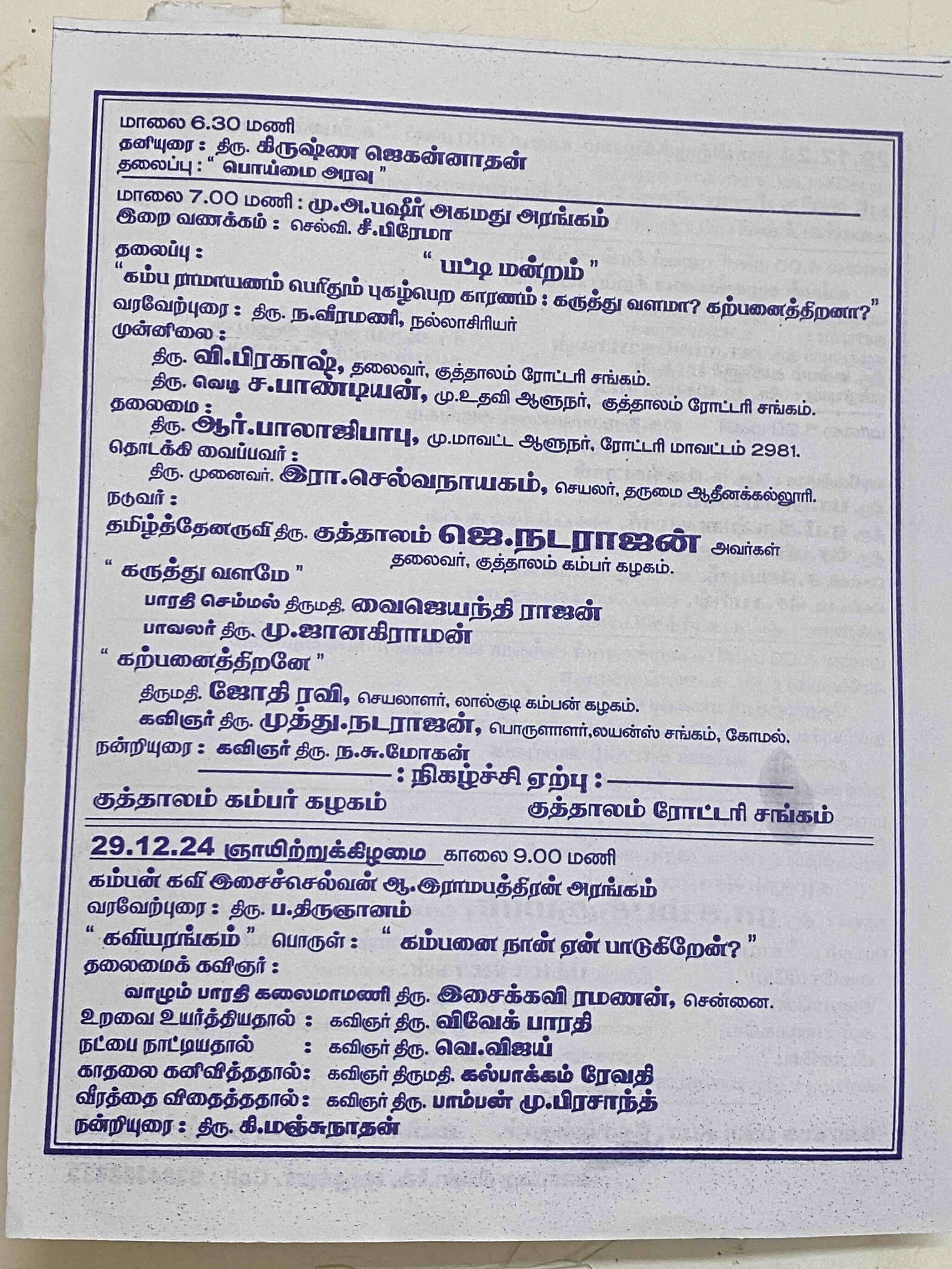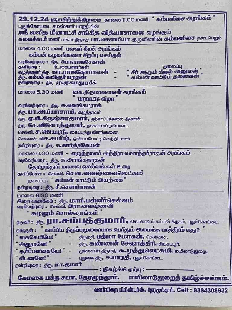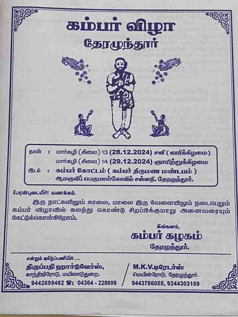மார்கழி 13,14 ( திசம்பர் 28,29) 2024. இடம்: கம்பர் கோட்டம். தேரழுந்தூர் ( மயிலாடுதுறை அருகில் )